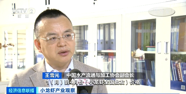 中国水产流通与加工协会副会长王雪光:今年1月到4月份,(小龙虾全国批发)价格最高达到过70元一公斤,5月就是38元一公斤了,接下来价格还会降。